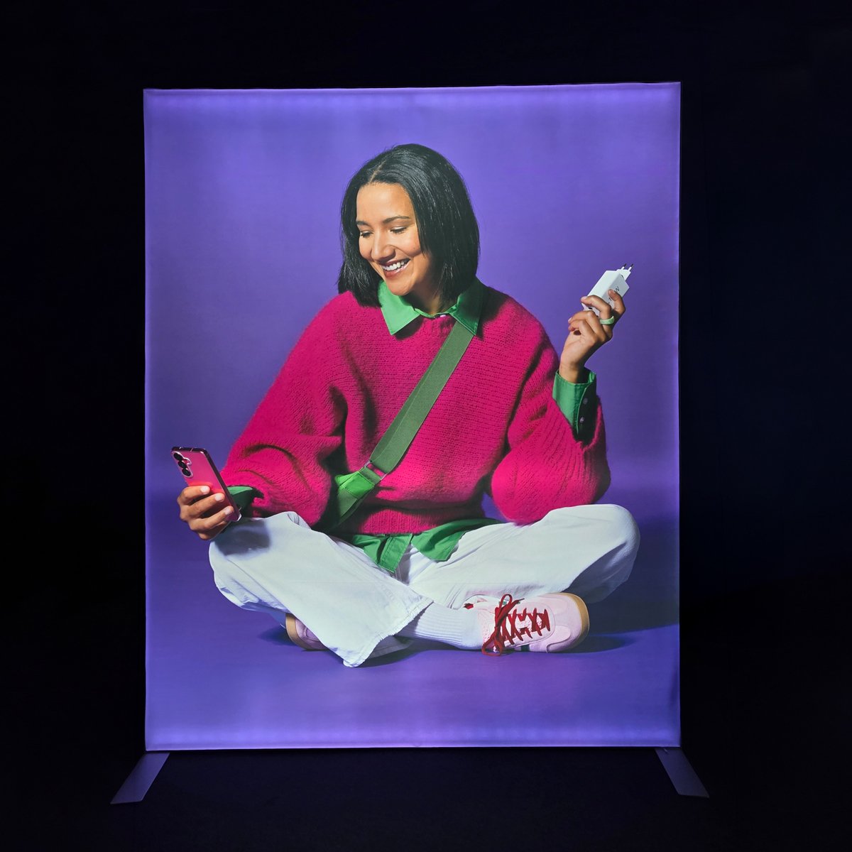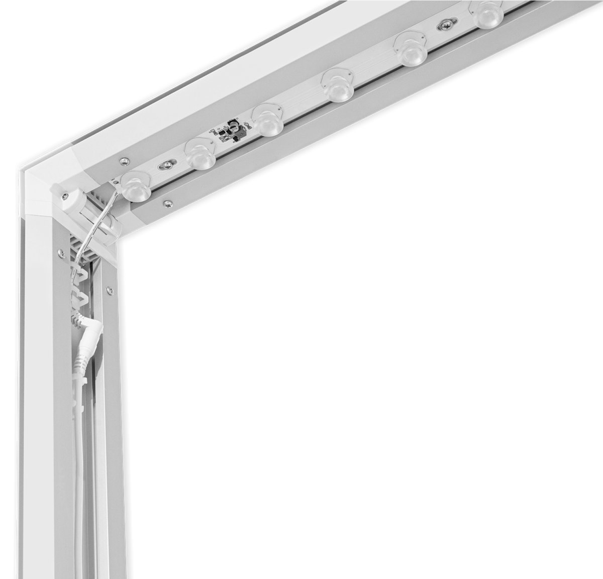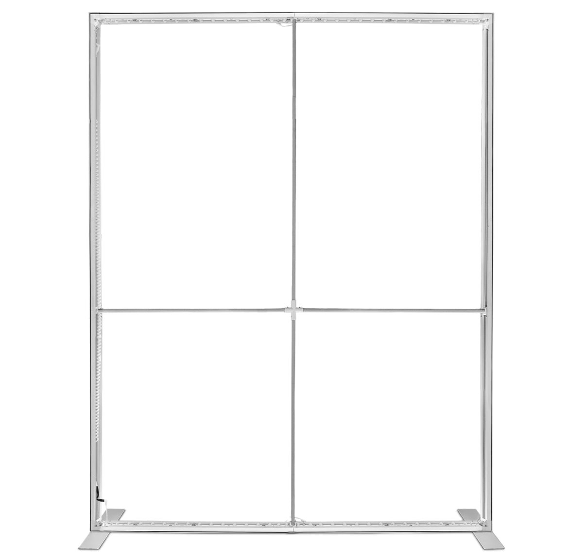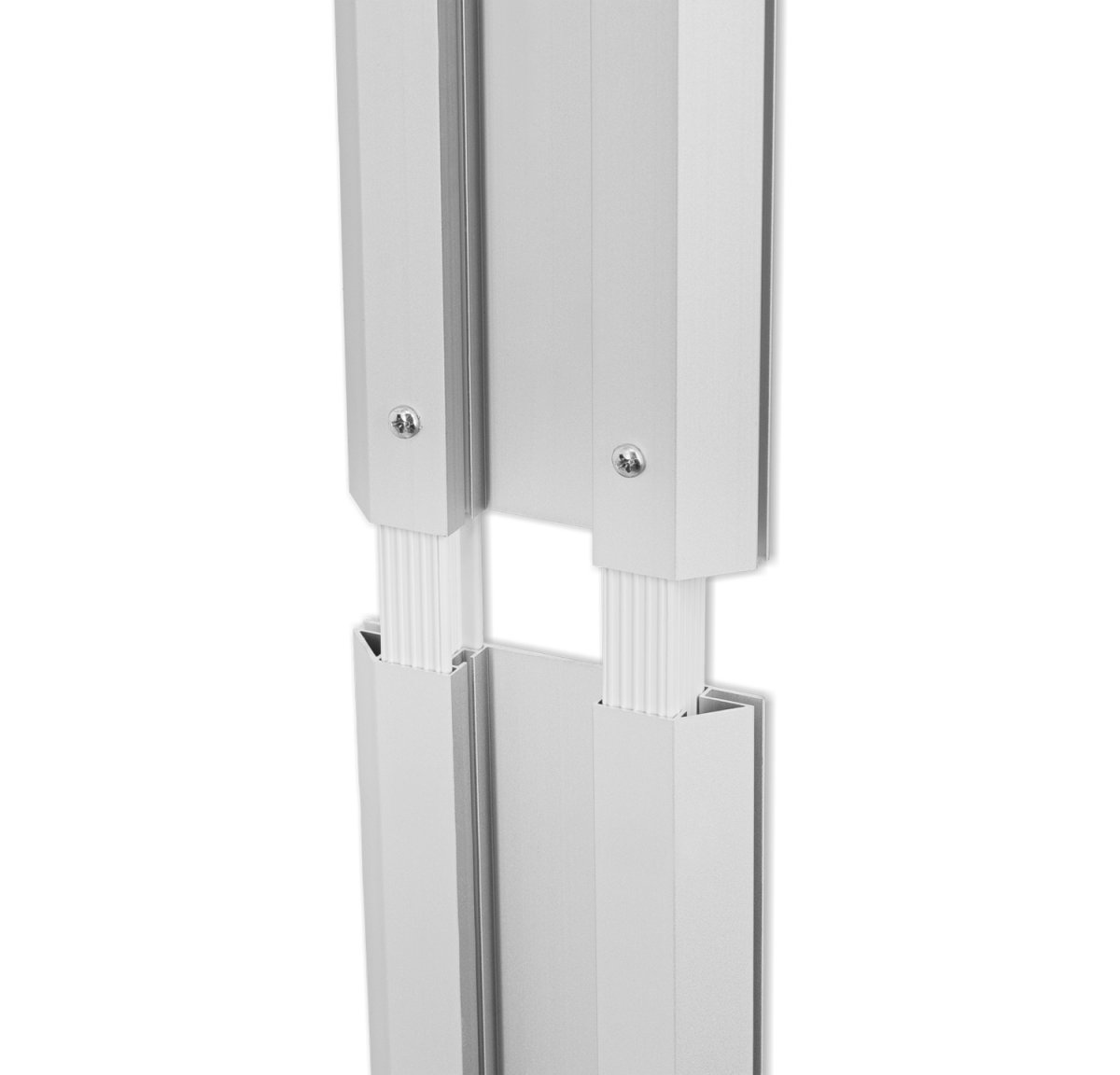 Wysokiej jakości wydruk na specjalnym materiale do podświetleń mocowany jest za pomocą taśmy silikonowej, dzięki czemu jest doskonale naciągnięty na konstrukcji ścianki. Sam montaż jest szybki, łatwy i bez użycia dodatkowych narzędzi. Szeroka rama, składane i stabilne nóżki są gwarancją stabilności i długowieczności tego systemu. W nowej odsłonie stelaż jest wyposażony w system FLEX, który ułatwia montaż jeszcze bardziej poprzez zastąpienie narożnych łączników zawiasami.