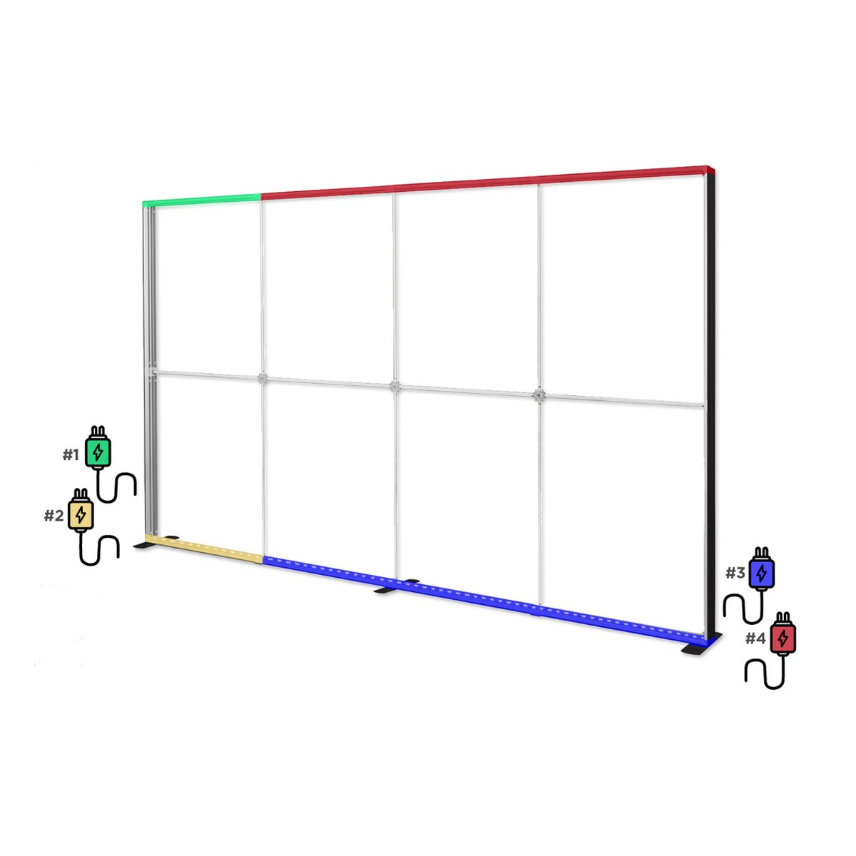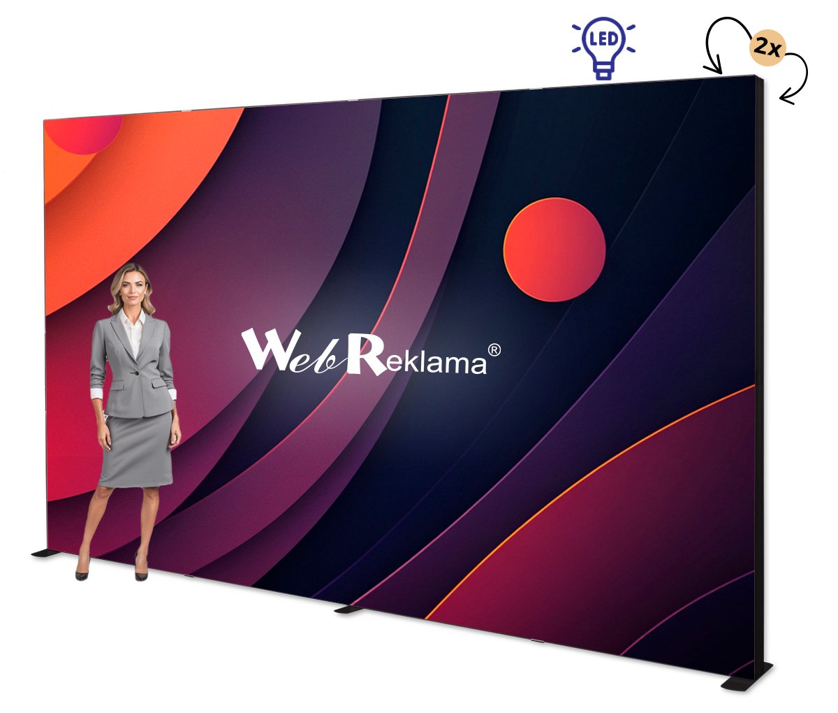 Podświetlana ścianka LED Premium czarna 400 × 250 cm to wolnostojący kaseton reklamowy w formacie XL, zaprojektowany z myślą o maksymalnym efekcie wizualnym. Zastosowanie solidnej, czarnej ramy o profilu 12 cm umożliwiło zwiększenie wysokości podświetlanych ścianek do imponujących 2,5 m, co znacząco podnosi widoczność ekspozycji.