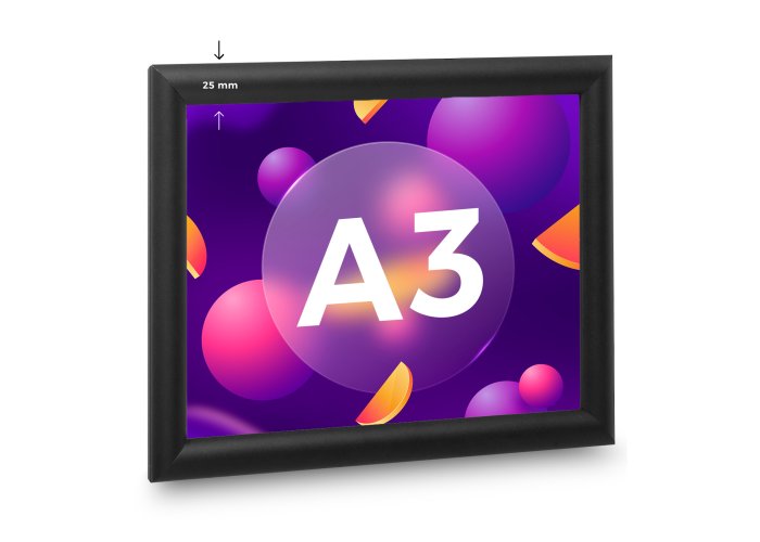 Ramka na plakaty OWZ o wymiarach A3 (297x420 mm). Cechą charakterystyczną tego produktu jest jego czarny kolor, który pozwala lepiej dopasować ramkę do otaczającej estetyki. OWZ to skrót od otwórz, włóż, zamknij. Najlepiej opisuje sposób wymiany wewnętrznej grafiki, który jest bardzo prosty i szybki. Ramka zbudowana jest z zatrzaskiwanych skrzydełek, które po otwarciu pozwalają na umieszczenie grafiki bez konieczności demontażu całej ramki. Grafiki są przykryte grubą osłoną z filtrem UV, który zabezpiecza przed blaknięciem. Sposób wykonania ramki: aluminium anodowane, profil 25 mm, malowanie proszkowe.