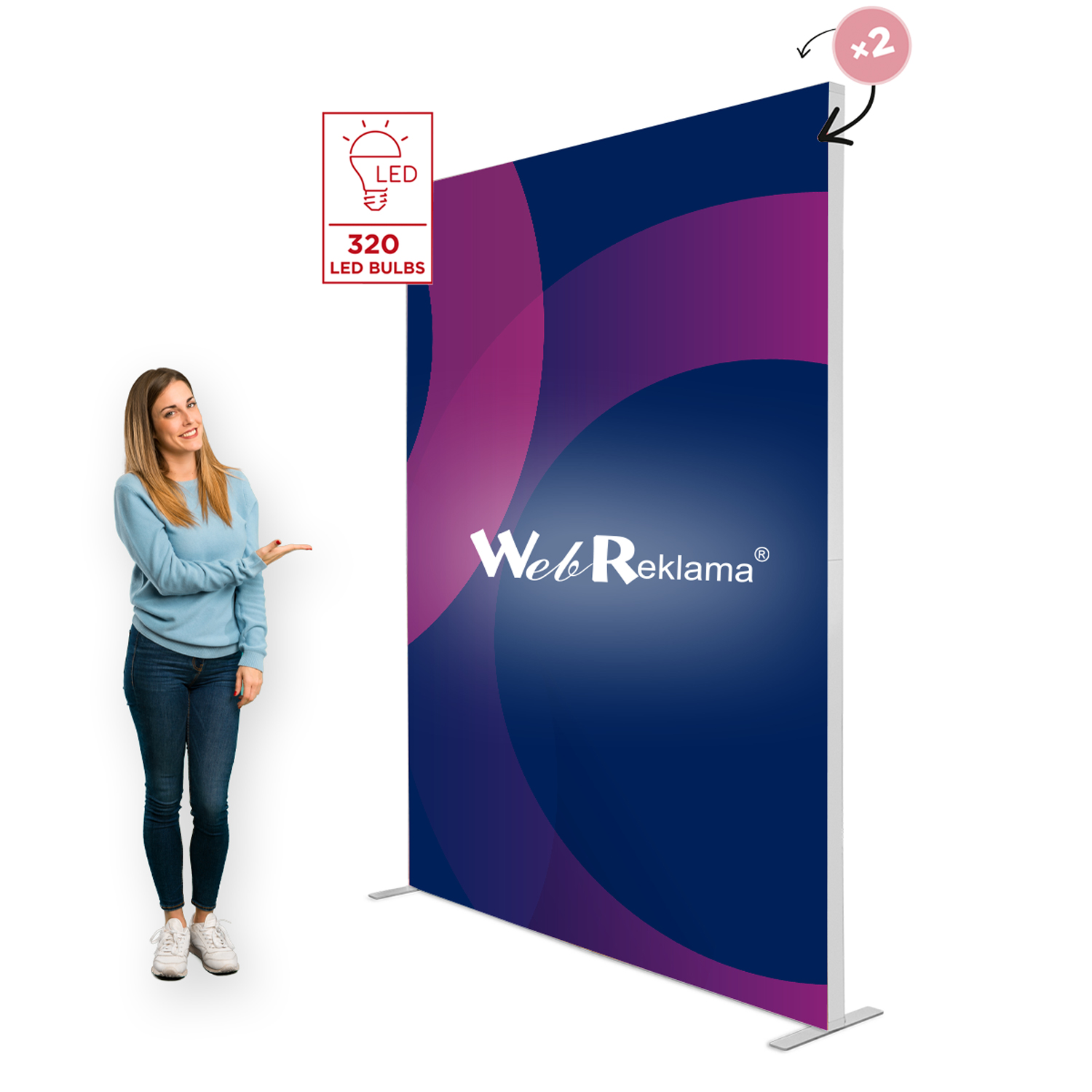 Dzięki zastosowaniu jednostronnej kurtyny ledowej zamiast lampek umieszczonych na obwodzie stelaża ścianka BACKLIGHT 200x250 jeszcze bardziej przyciąga uwagę swym równomiernym i mocnym oświetleniem.