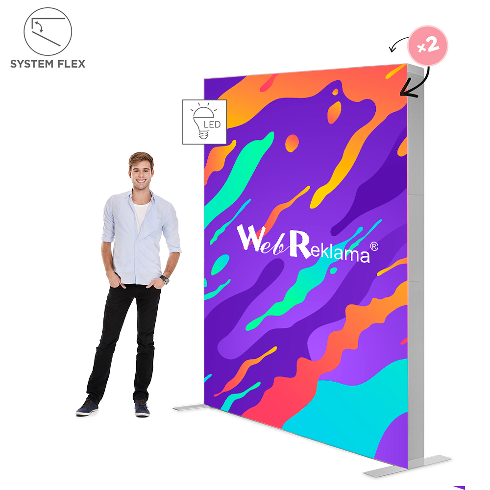 Wysokiej jakości wydruk na specjalnym materiale do podświetleń mocowany jest za pomocą taśmy silikonowej, dzięki czemu jest doskonale naciągnięty na konstrukcji ścianki. Sam montaż jest szybki, łatwy i bez użycia dodatkowych narzędzi. Szeroka rama, składane i stabilne nóżki są gwarancją stabilności i długowieczności tego systemu. W nowej odsłonie stelaż jest wyposażony w system FLEX, który ułatwia montaż jeszcze bardziej poprzez zastąpienie narożnych łączników zawiasami.