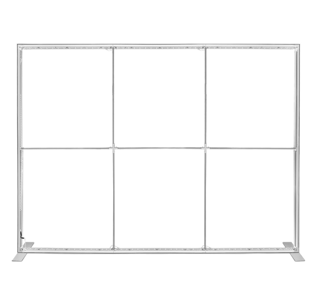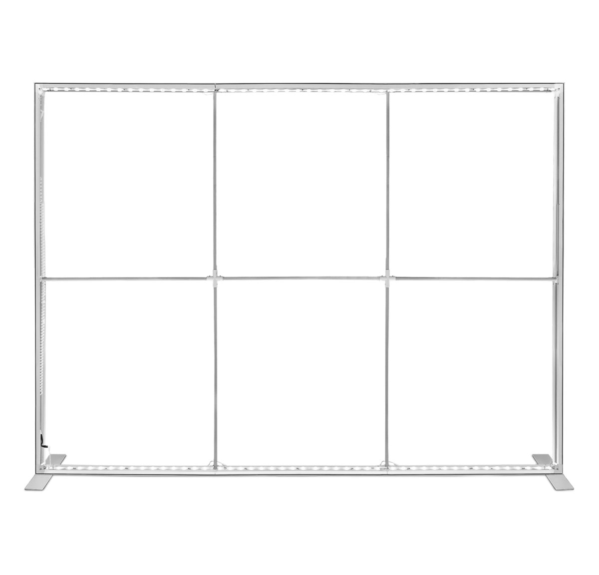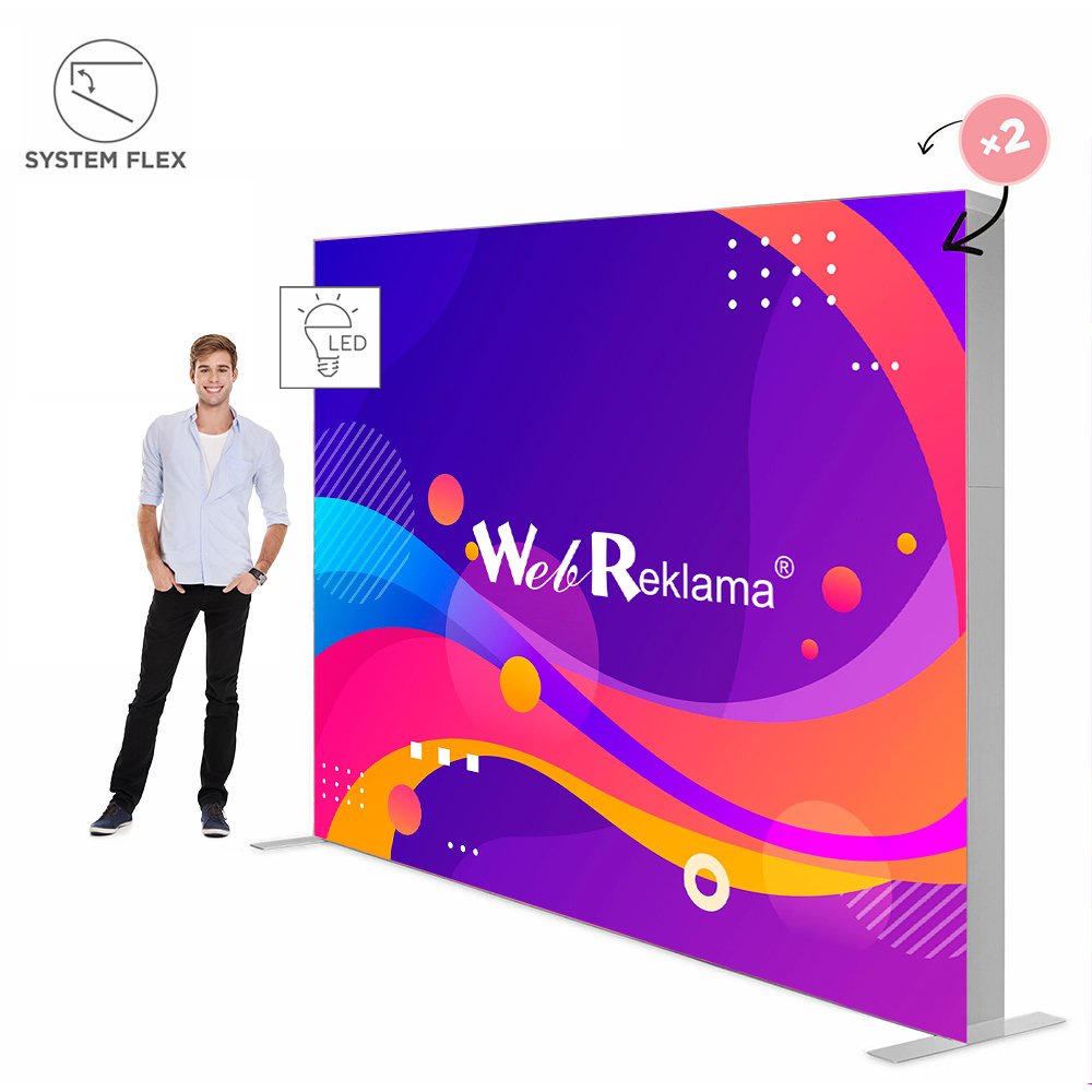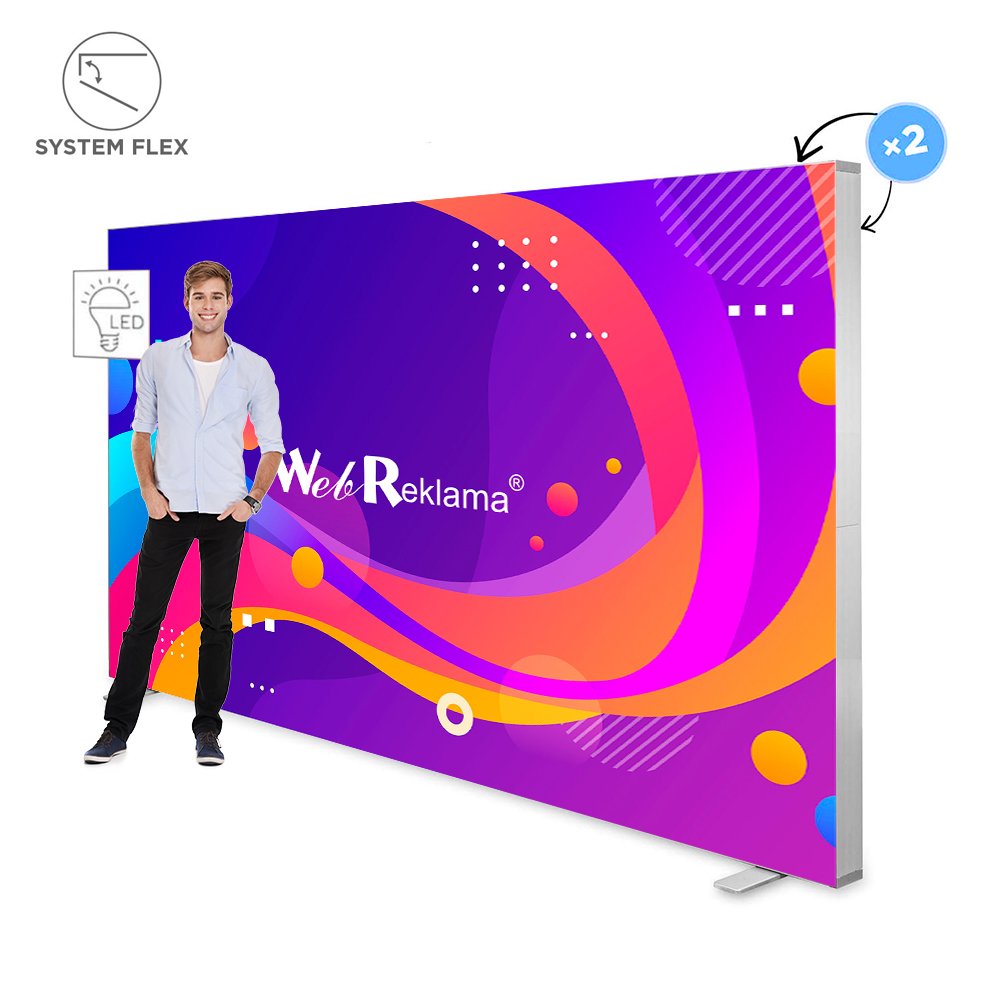 Zintegrowane oświetlenie w postaci 96 żarówek LED rozłożonych wzdłuż dolnej i górnej krawędzi zapewni jeszcze lepsze efekty świetlne. Wydruk na najwyższej jakości materiale do podświetleń montowany jest za pomocą taśmy silikonowej, dzięki czemu reklama jest pięknie napięta. Narożniki stelażu, wyposażone w zawiasowy system flex pozwalają na jeszcze szybszy montaż całości. Sam montaż ścianki reklamowej nie wymaga użycia narzędzi i jak większość naszych produktów zajmuje mało czasu.