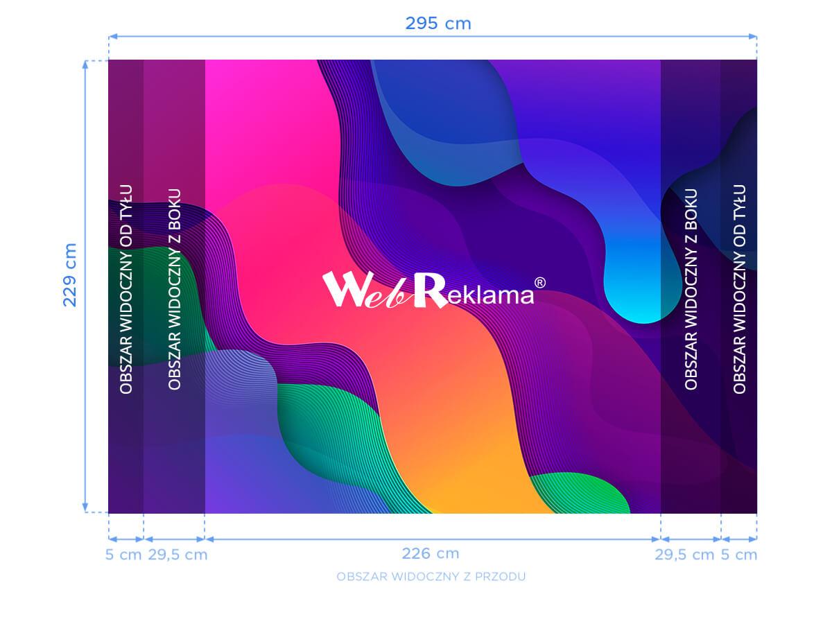 Ścianka POP UP kojarzy Ci się z ciężkimi brytami, które ciężko równo zaczepić? Dzięki grafice reklamowej drukowanej na lekkim materiale poliestrowym rozłożenie ścianki typu pop-up jest naprawdę ekspresowe! Wydruk na materiale tekstylnym decor 200g w rozmiarze 226cm x 229cm (lub w rozmiarze 295cm x 229cm, gdy chcemy zasłonić też boki ścianki) montowany jest na stelażu na rzep.