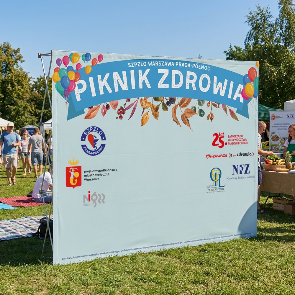 Zestaw zawiera: składany stelaż ścianki, wydruk z wszytym rzepem, torbę transportową.