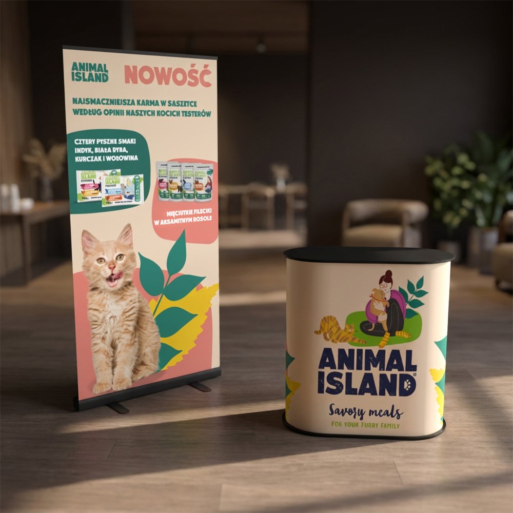 Roll-up standard black 85x200 oraz Trybunka P1 to podstawowy zestaw wystawienniczy, z którym śmiało można zaprezentować swoją firmę na targach. Rollup i trybunkę umieściliśmy na obszarze 2,5m x 2,5m.
