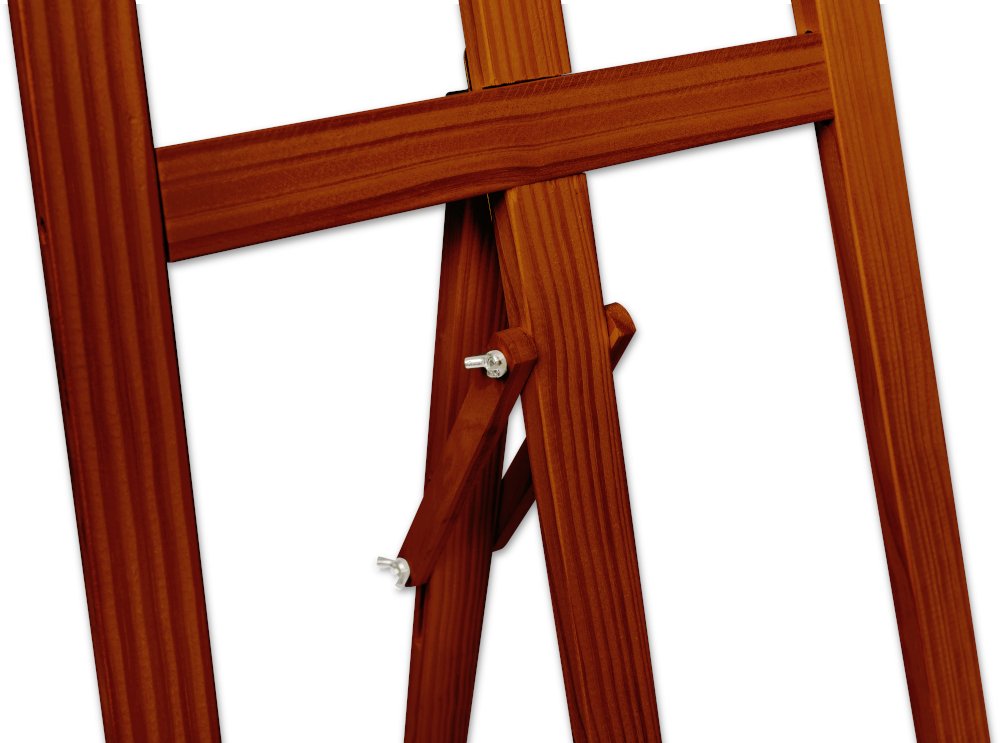 Regulowane uchwyty zapewniają stabilnej mocowanie ramy czy tablicy. Szeroki zakres ich regulacji umożliwia zastosowanie ram o różnej wielkości. Sztalugę drewnianą można bardzo łatwo złożyć i przechować czy przewieźć.