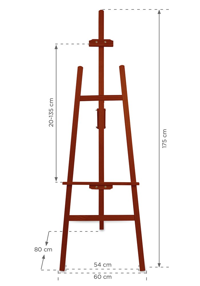Sztaluga wykonana z drewna sosnowego o bardzo stabilnej, a jednocześnie lekkiej konstrukcji. Elementy zostały wykonane z drewna, dzięki czemu otrzymujemy produkt o wysokiej jakości. Sztaluga pomalowana została bejcą do drewna na kolor mahoń i będzie z pewnością dobrze się komponować w tradycyjnych wnętrzach. Świetni sprawdzi się jako stojak nie tylko pod obrazy, ale też np. na tablice reklamowe w eleganckim biurze. Ładnie komponuje się też z drewnianymi tablicami kredowymi o brązowych ramach.