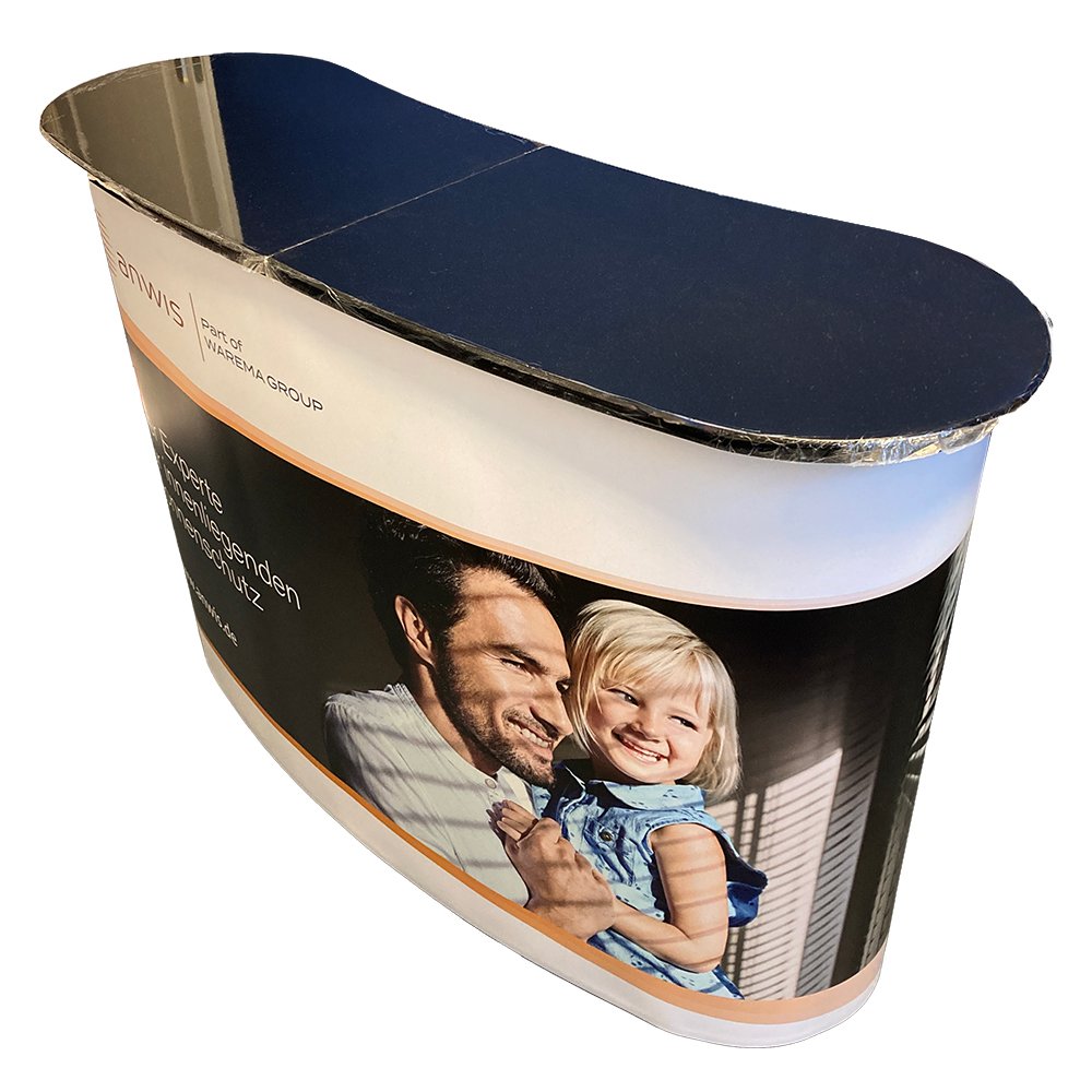 Stoisko wystawiennicze POP UP 2x2 to konstrukcja dedykowana na targi, wystawy i eventy firmowe. Po rozłożeniu duża powierzchnia boczna, osłonięta brytem PCV stanowi świetne miejsce do naniesienia grafiki reklamowej, która będzie widoczna z daleka. Dzięki temu stoisko wystawiennicze przyciąga wzrok i pozwala utkwić w pamięci uczestników eventów. System spełnia nie tylko funkcje wizerunkowe, ale posiada też praktyczne cechy. Blat w kształcie nerki pozwala na umieszczenie wielu materiałów reklamowych jak katalogi, foldery, ulotki, postawienie laptopa. Może też stanowić dobre stanowisko do pracy dla nawet dwóch handlowców.