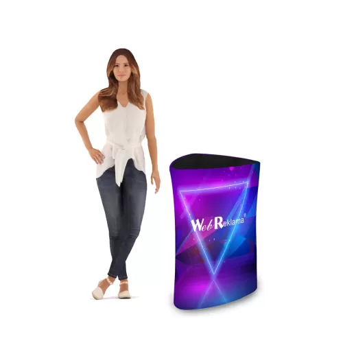 Stolik reklamowy o charakterystycznym trójkątnym kształcie blatu. Górna i dolna część stolika o wymiarach 65 cm szerokości i 65 cm głębokości powoduje, że jest to konstrukcja wyjątkowo kompaktowa i nawet po rozłożeniu nie zajmuje zbyt wiele miejsca. Dzięki możliwości osłonięcia boków stolika reklamowego tkaniną z nadrukiem firmowym jest możliwość uzyskania rzucającego się w oczy systemu wystawowego. Niestandardowe kształty odbiegające od typowych stoisk reklamowych pozwalają wyróżnić się w tłumie. Stolik reklamowy z trójkątnym blatem może stanowić świetne miejsce pracy na targach, eventach dla jednego handlowca. Wysokość rozłożego stolika reklamowego to 100cm. Powierzchnia blatu pozwalaja na umieszczenie na nim laptopa lub materiałów reklamowych i promocyjnych.